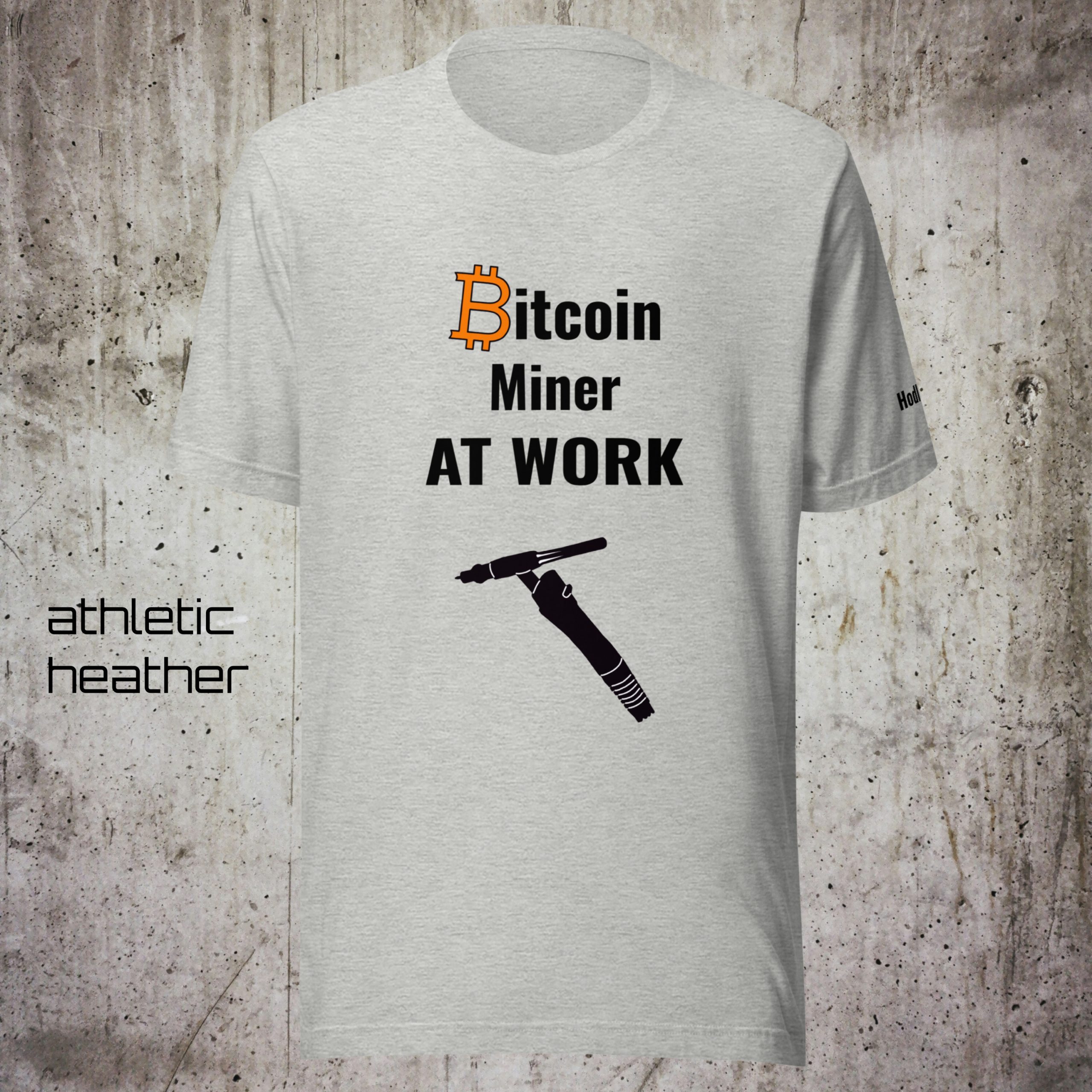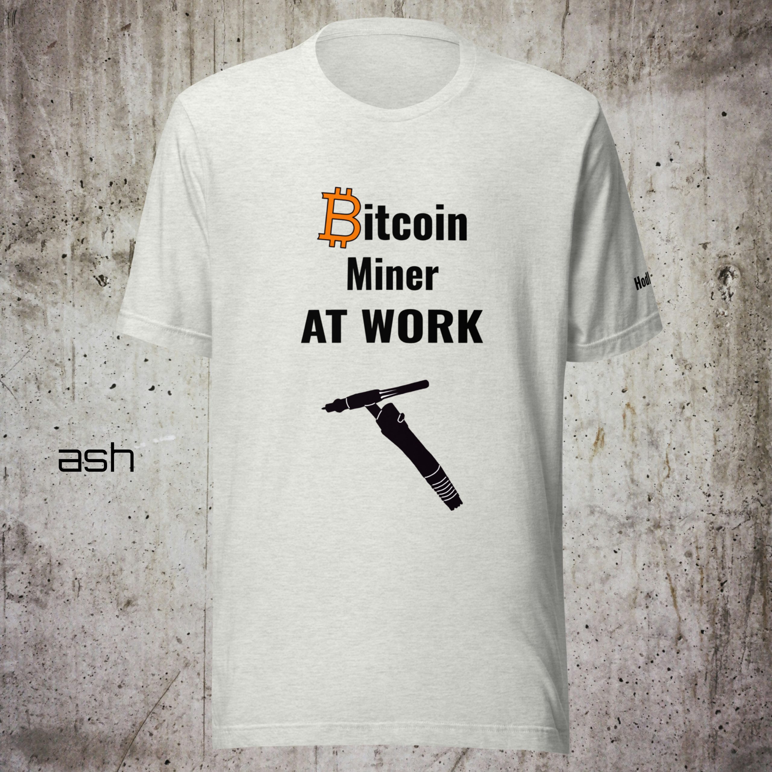 The minimalist design features the iconic “Bitcoin Miner at Work” typography paired with a stylized TIG welding torch – technical, bold, and authentic.